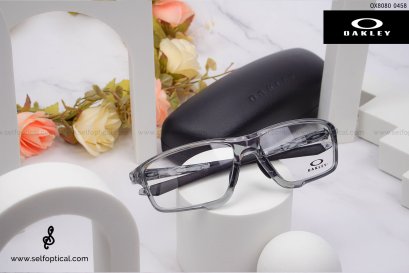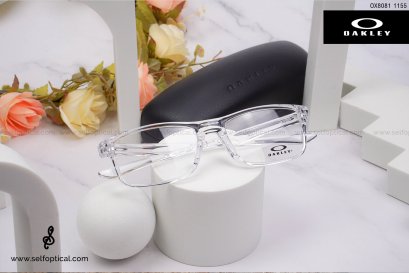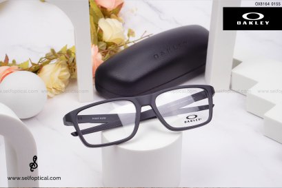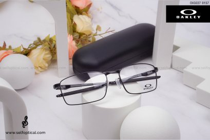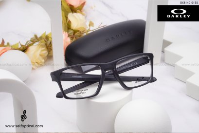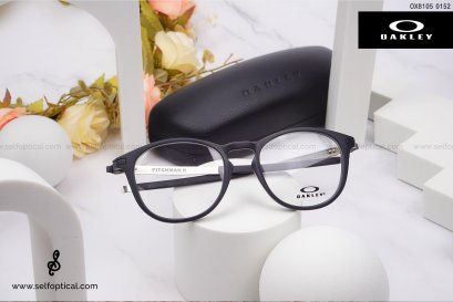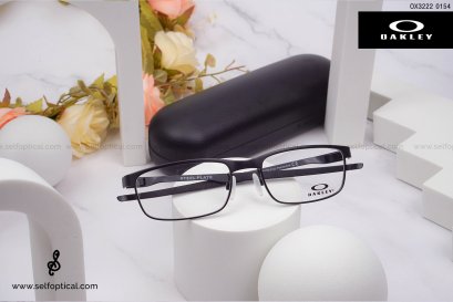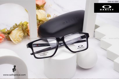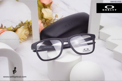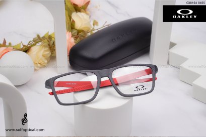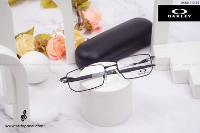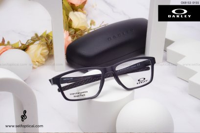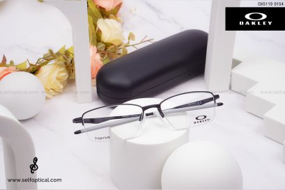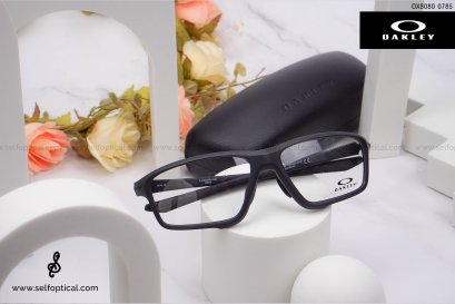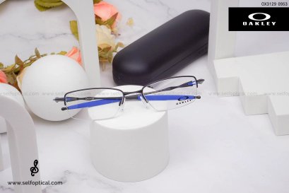 กรอบแว่นทรงสปอร์ต สไตล์ Semi Rimless ครึ่งกรอบ ด้านบนสีดำด้าน ขาแว่นเรียวเล็ก มีลาย Logo ตัว O เชื่อมกับข้อต่อ ตัดกับสีน้ำเงินของปลายขาแว่นซิลิโคน
