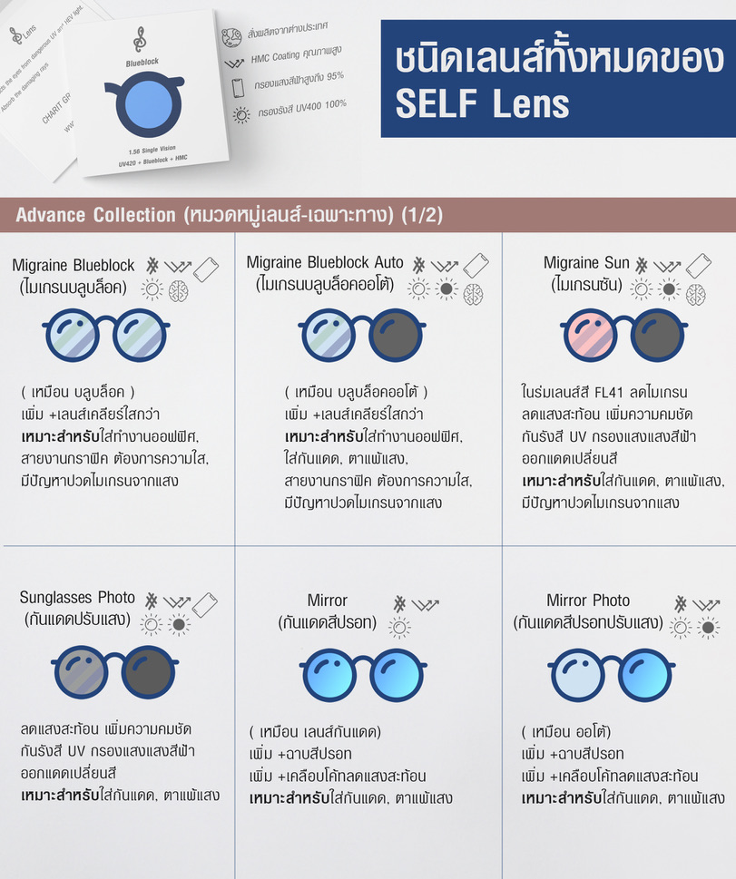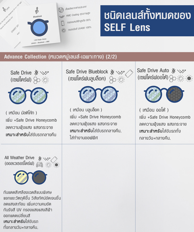2. มาต่อกันที่ หมวด Advance Collection โดยคอลเลคชั่นนี้จะเป็นเลนส์เฉพาะทาง ซึ่งจะช่วยแกัปัญหาในเรื่องเฉพาะเรื่องใดเรื่องหนึ่ง ไม่ว่าจะเป็นปัญหาไมเกรน ปัญหาทัศนวิสัยในการขับขี่ ซึ่งเลนส์ทั่วไปจะไม่มีฟังก์ชั่นเฉพาะทางเหล่านี้ จึงไม่สามารถแก้ไขปัญหาเหล่านี้ได้อย่างตรงจุดจริงๆ