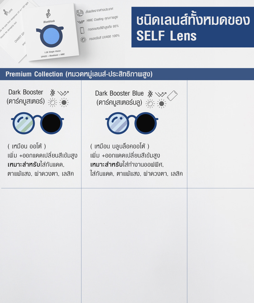 3. สุดท้าย หมวด Premium Collection ซึ่งคอลเลคชั่นนี้จะเป็นเลนส์ที่ใช้วัสดุที่มีคุณภาพสูงสุด เพื่อให้การใช้งานมีประสิทธิภาพที่สูงที่สุด ไม่ว่าจะเป็น วัสดุ, สารเคลือบ, เทคโนโลยีในการอบ ชุบเคลือบ ทำให้มีประสิทธิภาพเทียบเท่าหรือเหนือกว่า แบรนด์ยักษ์ใหญ่ในท้องตลาด แต่จำหน่ายในราคาที่เอื้อมถึง