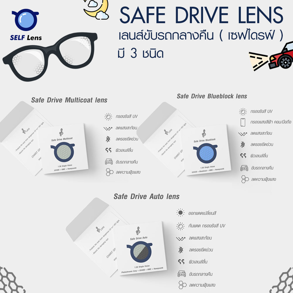 โดยเลนส์ Safe Drive จะแยกย่อยได้อีก 3 ชนิด ( เพื่อตอบโจทย์คนที่ต้องใส่แว่นทำกิจกรรมอย่างอื่นนอกจากขับรถด้วย ได้แก่ )